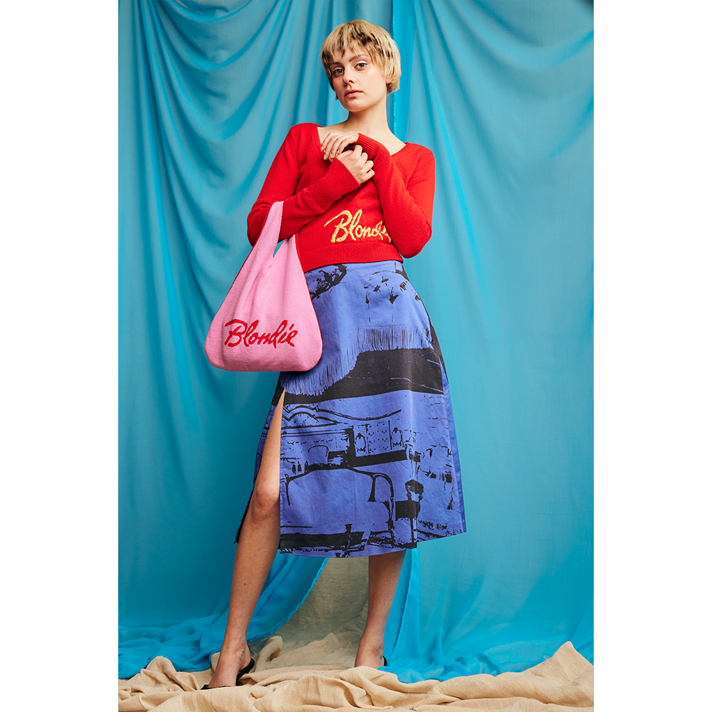 Handcrafted in England from 100% lambswool. The bag has the slogan "Call Me" on the front and 'Blondie' on the back.
