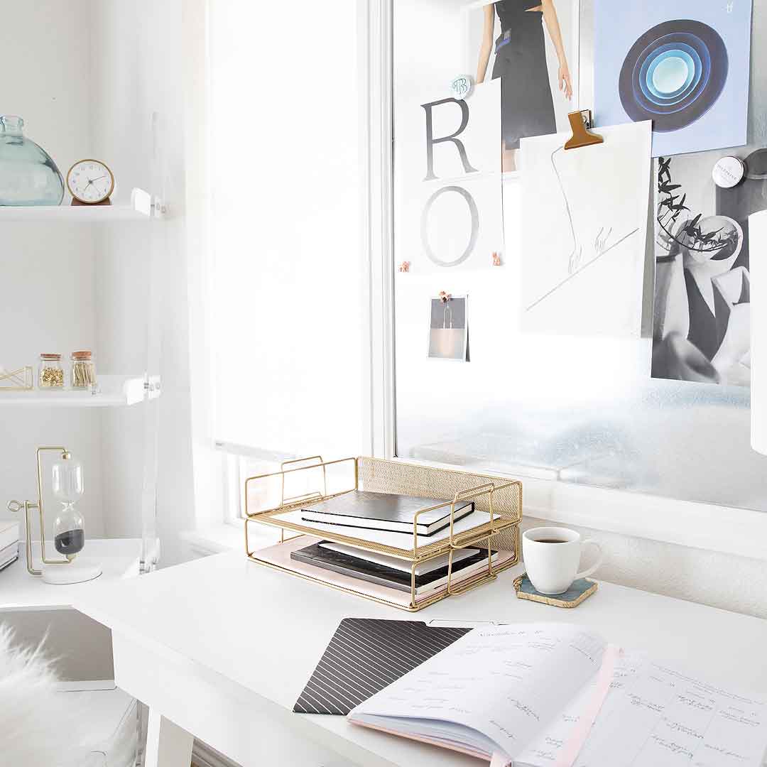 Gold office desk accessories like a gold paper tray or gold file organizer are so chic. Stack these two metal gold paper trays together for a way to easily store all your important files in an inbox on your desk.